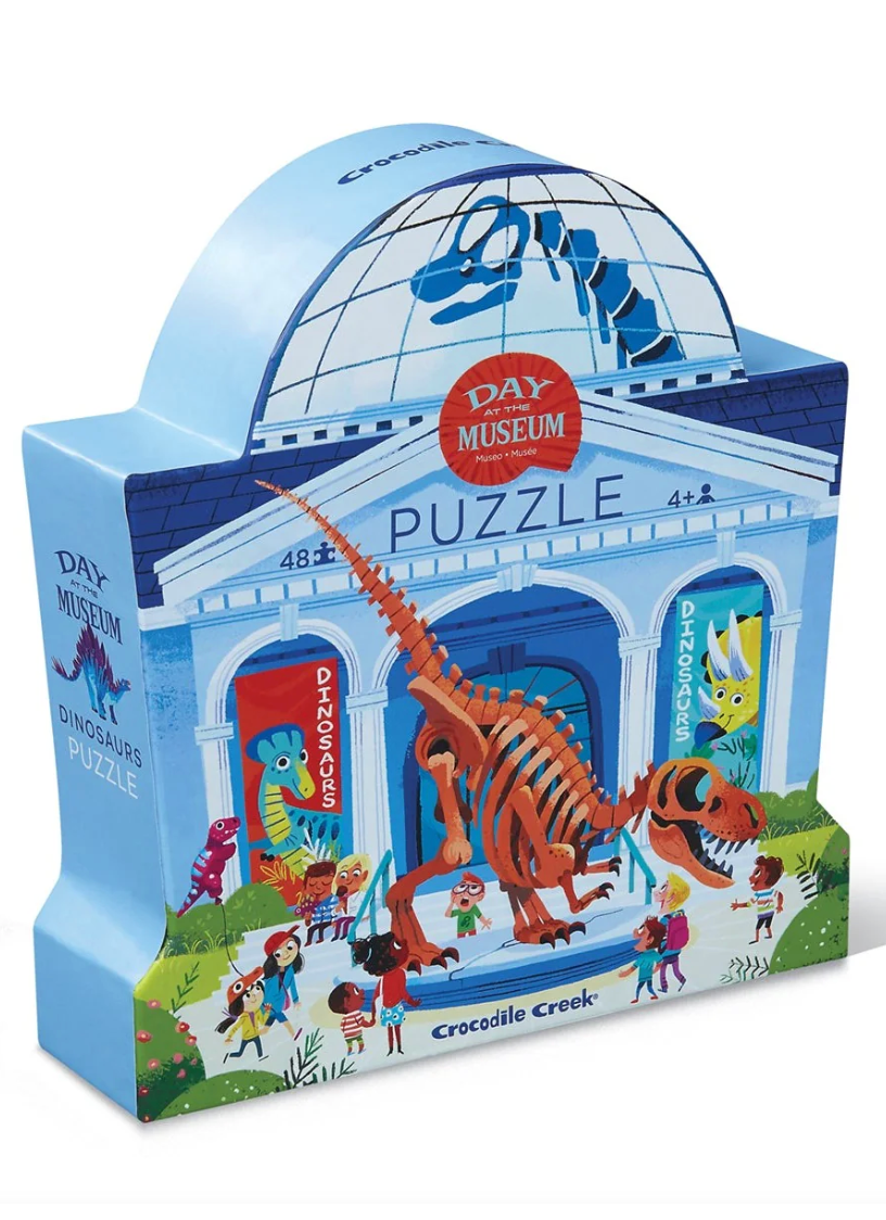 Kids Love to Visit the Dinosaur Museum! This Crocodile Creek Day at the Museum 48 piece puzzle will transport you to the world of a fun, whimsical natural history museum revisiting a favorite museum or remembering a wonderful outing with family, friends or classmates! Walk into the great hall of the museum and be awed by the incredible giant dinosaurs as well as mummies on the loose, archeological digs, children from all kinds of backgrounds and much, much more! This richly detailed 18” x 24” puzzle is not only interesting and informative but humorous too. Packaged in a uniquely museum shaped box, it is guaranteed to delight both kids and parents.