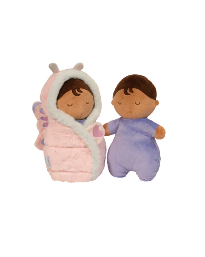 Snug in her cozy cocoon, a dreamy Baby doll waits to see what imaginative adventures the day will bring! Our Baby Butterfly Hug has been designed with creativity in mind and encourages interaction with its soft textures and innovative concept. Squeezably soft and dressed in a gentle indigo color, Baby fits comfortably inside her matching Butterfly themed swaddle accessory. Detailed with a heart embellishment, the swaddle can be wrapped snugly around Baby with its simple to use closure. A pair of antennae and patterned butterfly wings will inspire little minds and spur on flights of fancy for them and Baby Butterfly Hug to share!
