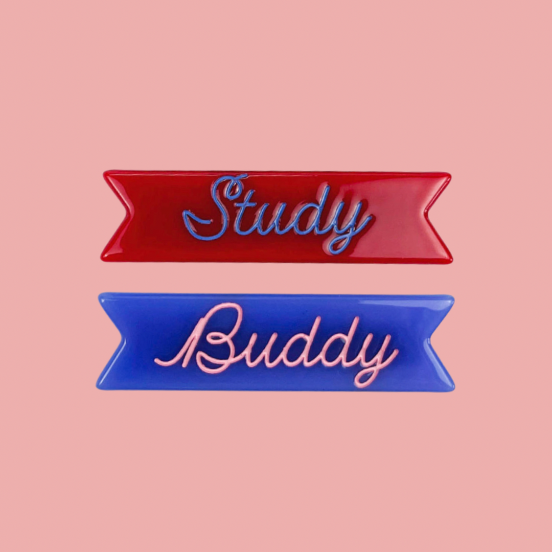 One pair of hair clips for the academically excellent that say "Study" and "Buddy."