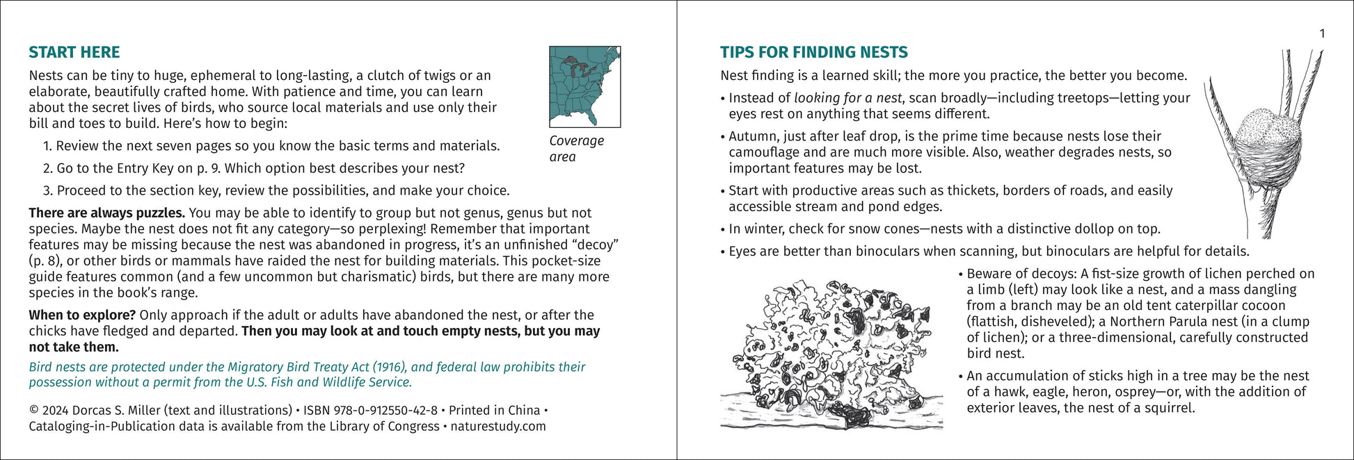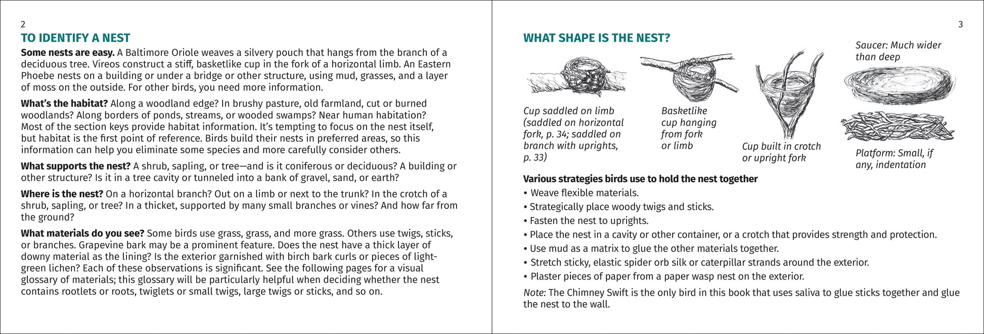 The booklet provides a dichotomous key to identifying aboveground bird nests. Simply answer a series of simple questions about the type, size, and location of the nest, as well as the materials from which it’s made. Along the way, professional illustrations help to guide you to a positive identification.