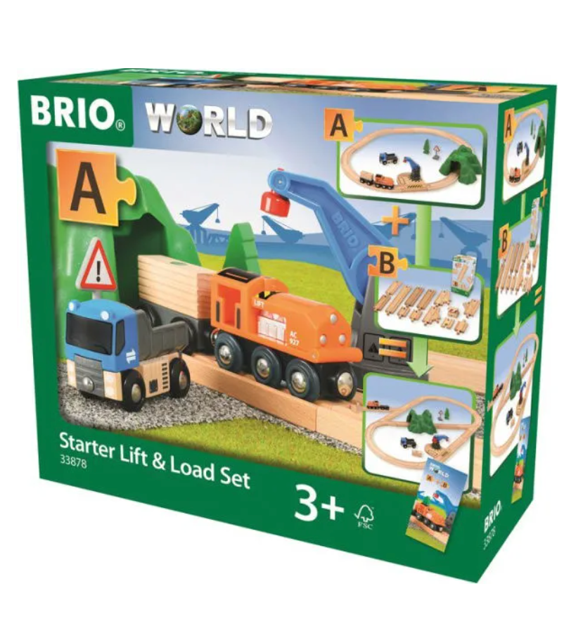 All aboard! Build your first BRIO World with this new Lift and Load Starter Set. The layout is packed with machine toys - grab crane, truck, a pop-up hood engine and wagon with load - even a warning sign, spruce and a small mountain to thunder through! Lift the cargo off the truck toy with the crane, turn and load onto the train. Works great with all products within BRIO World.