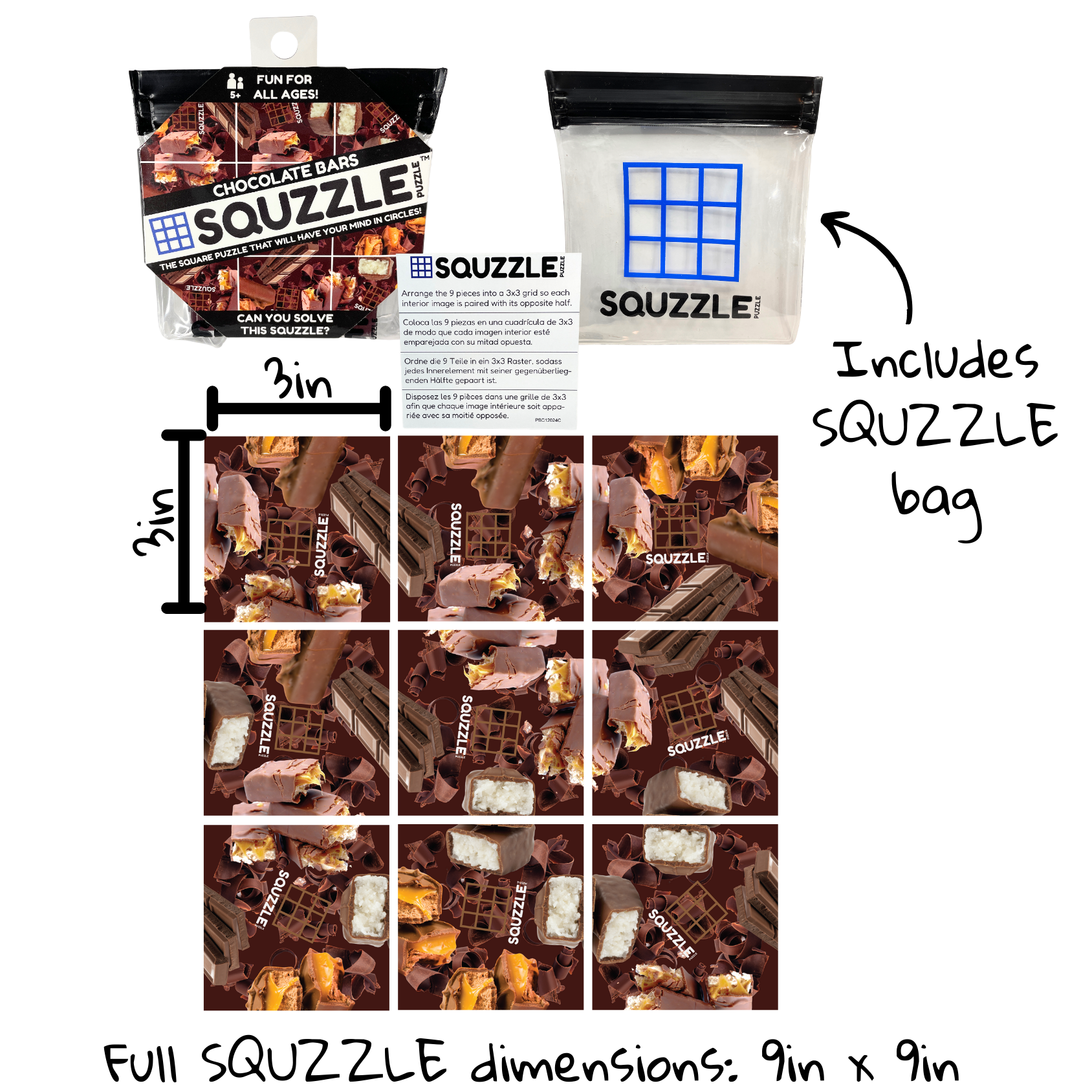 Designed for convenience, Squzzles come packaged in a compact 4.5"x 4.5" x 0.5" bag. Each Squzzle piece measures 3in x 3in with the entire puzzle measuring 9in x 9in when arranged in a 3x3 playing grid to solve. Play at a restaurant, on an airplane or at home- Squzzles are the perfect brain game.