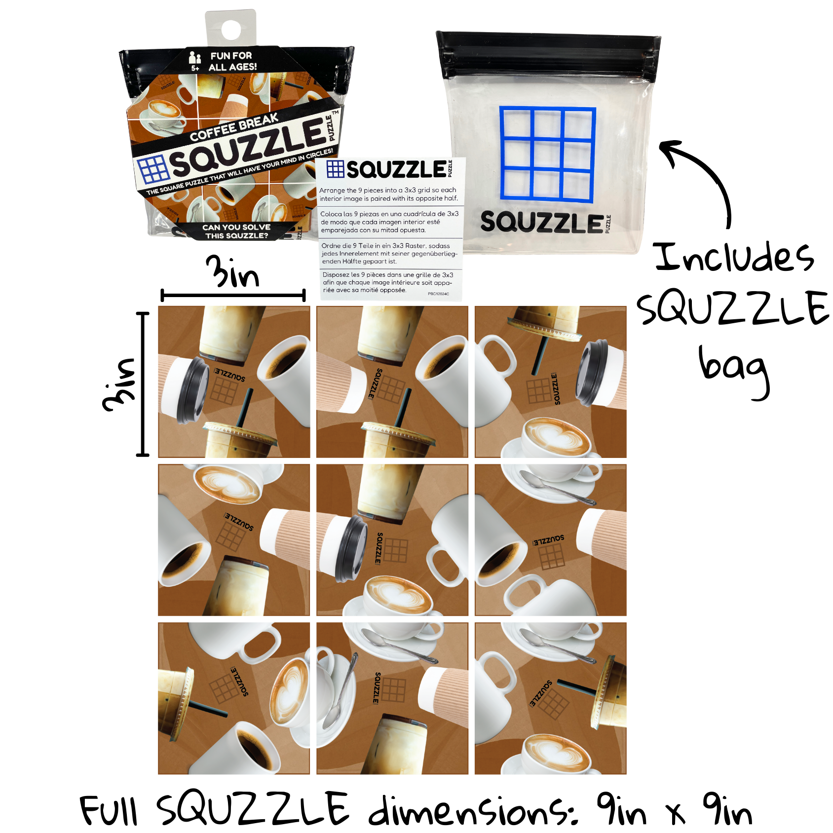 Designed for convenience, Squzzles come packaged in a compact 4.5"x 4.5" x 0.5" bag. Each Squzzle piece measures 3in x 3in with the entire puzzle measuring 9in x 9in when arranged in a 3x3 playing grid to solve. Play at a restaurant, on an airplane or at home- Squzzles are the perfect brain game.
