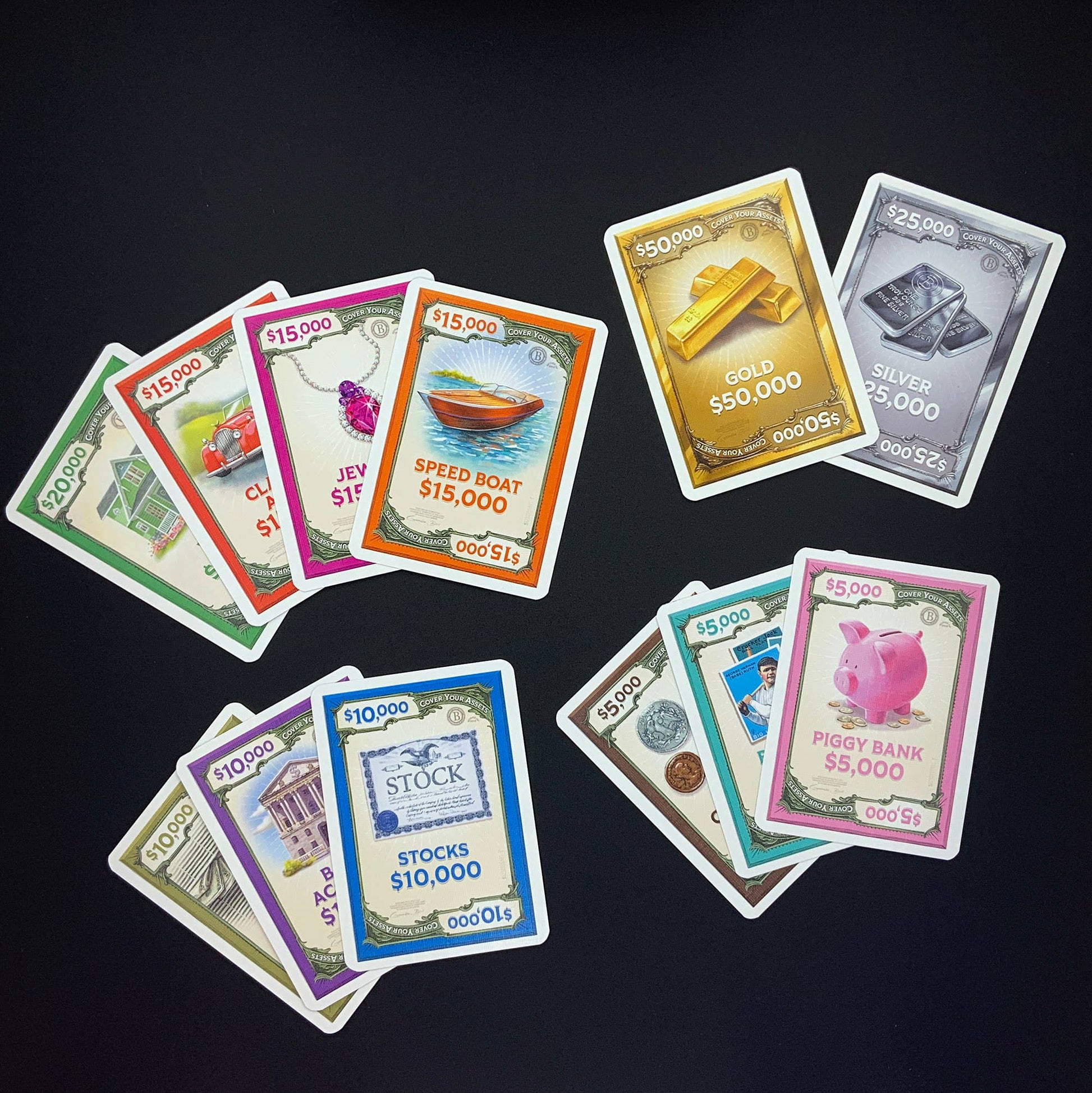 Create stacks of assets by pairing sets of asset cards, like Piggy Banks, Cash Under the Mattress, Jewels, Classic Autos, and more. Each new set is stacked atop the previous set, literally COVERING your Assets!