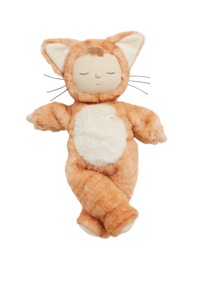 Jinx is posable, made from the plushest outer and features the sweetest embroidered face with a little tuft of hair. Each Cozy Dinkum Cat wears a non-removable suit with two soft furry ears, soft thread whiskers, and a rainbow right over their heart.