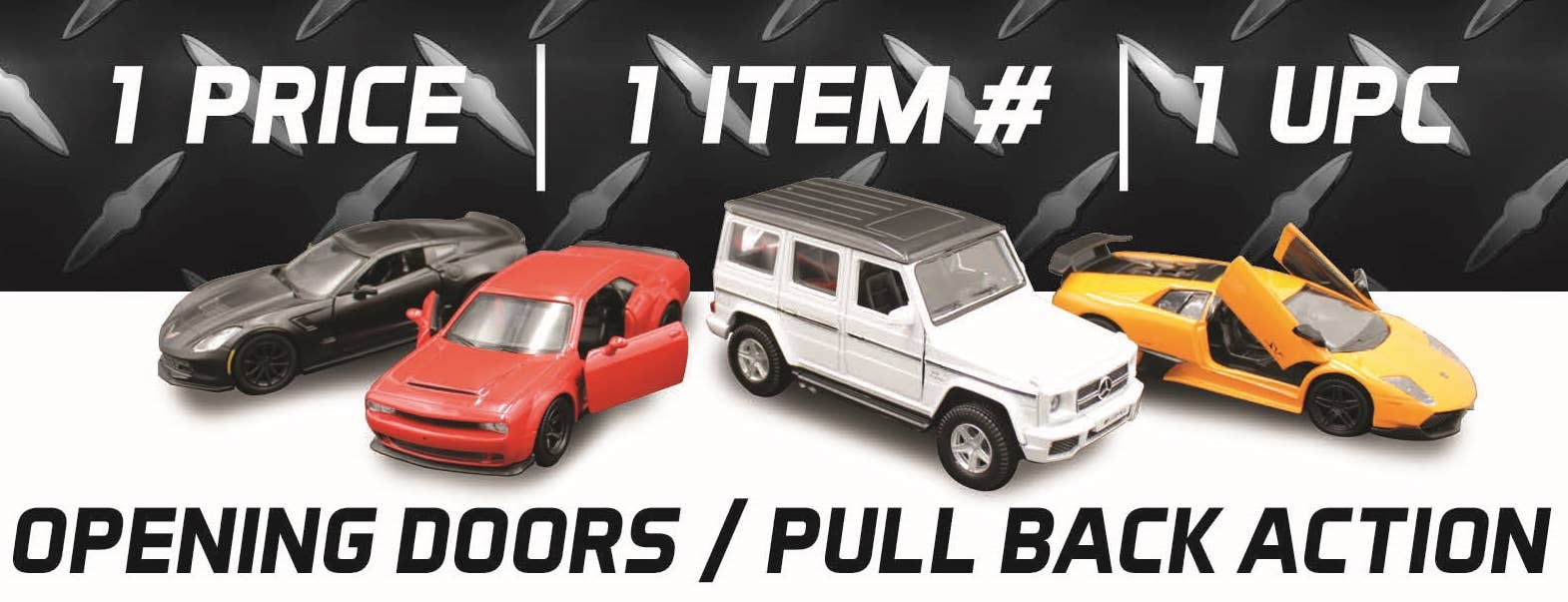 Officially licensed 5" pullback diecast cars with opening doors. Assortment Contains 1969 Camaro SS, 2015 Ford Mustang, Jeep Wrangler Convertible, 2017 Nissan GT-R, Porsche 918 Spider, VW Samba Bus, McLaren 650S, Lamborghini LP570-4 Gallardo, Chevy Camaro Police, Garbage Truck, Cement Truck.