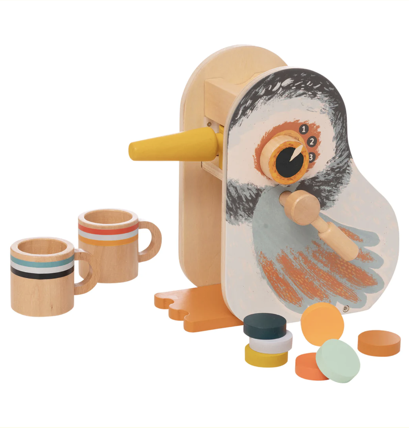 Rise and shine with the Early Bird Espresso wood toy play set. This 11 piece wood toy set includes one bird-shaped espresso maker, one portafilter, two cups and seven colorful espresso chips that fit inside portafilter and cups. Features two knobs/dials that click with every turn and a steam nozzle that swivels. Encourages imaginative role-play and motor development.