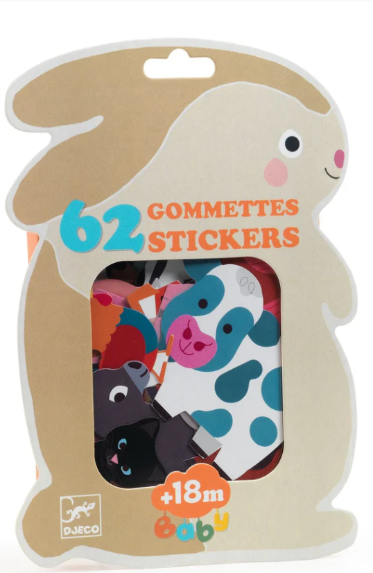 My first stickers! Open the transparent box to discover 62 farm-animal stickers. Baby’s first stickers: thick, perforated paper so they can peel them off without help.