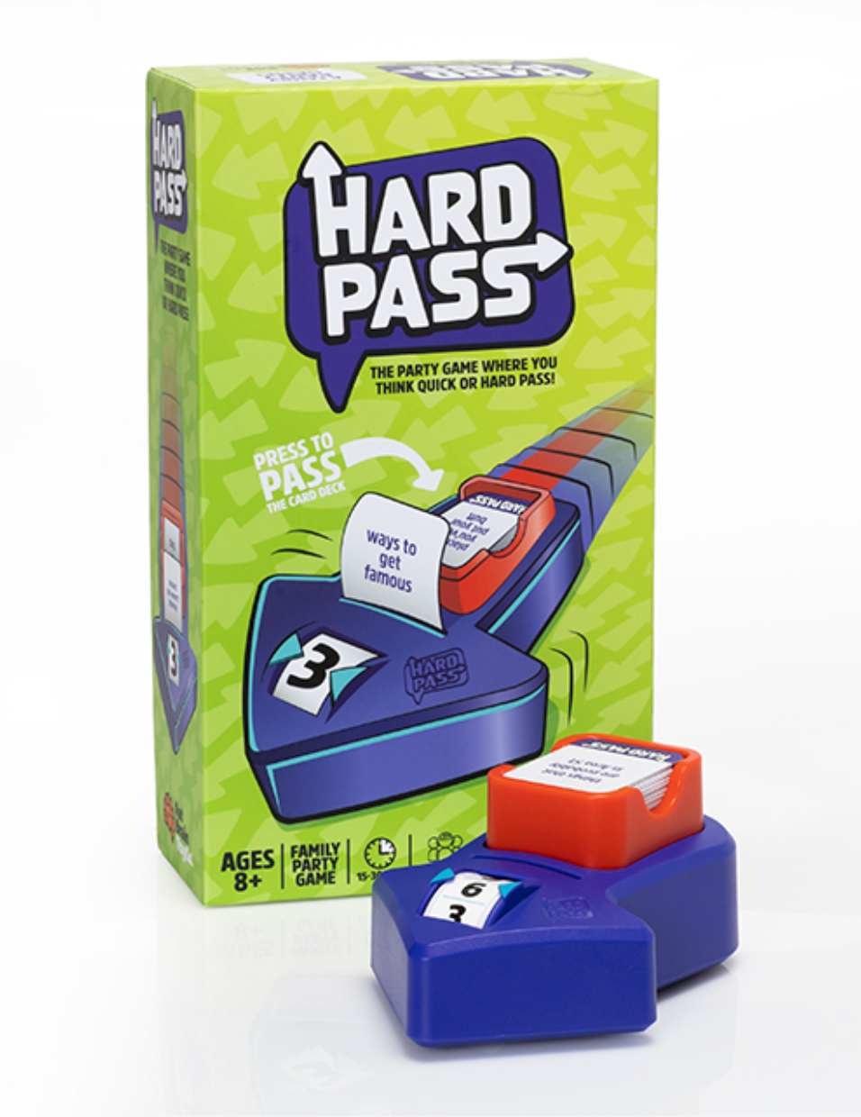Pick a prompt and press down on the cardholder to send it rolling to anyone at the table. Whoever gets it has two options: 1) Come up with as many answers as the number dial demands in under 30 seconds. Or 2) "hard pass" it to someone else to try and benefit from their failure. Can you quickly think of five things that can be fixed with tape? Can you hold back the giggles as you describe three ways to hide a fart? Do you have the guts to bring up six "things we don't talk about"? If you can complete the prompt before the time is up, you get to keep the card as a point. If you can't, whoever sent it to you gets to keep the card. The first to earn five points wins! Add a playful mix of laughter and awkwardness to your next game night with the hilarious game of Hard Pass.