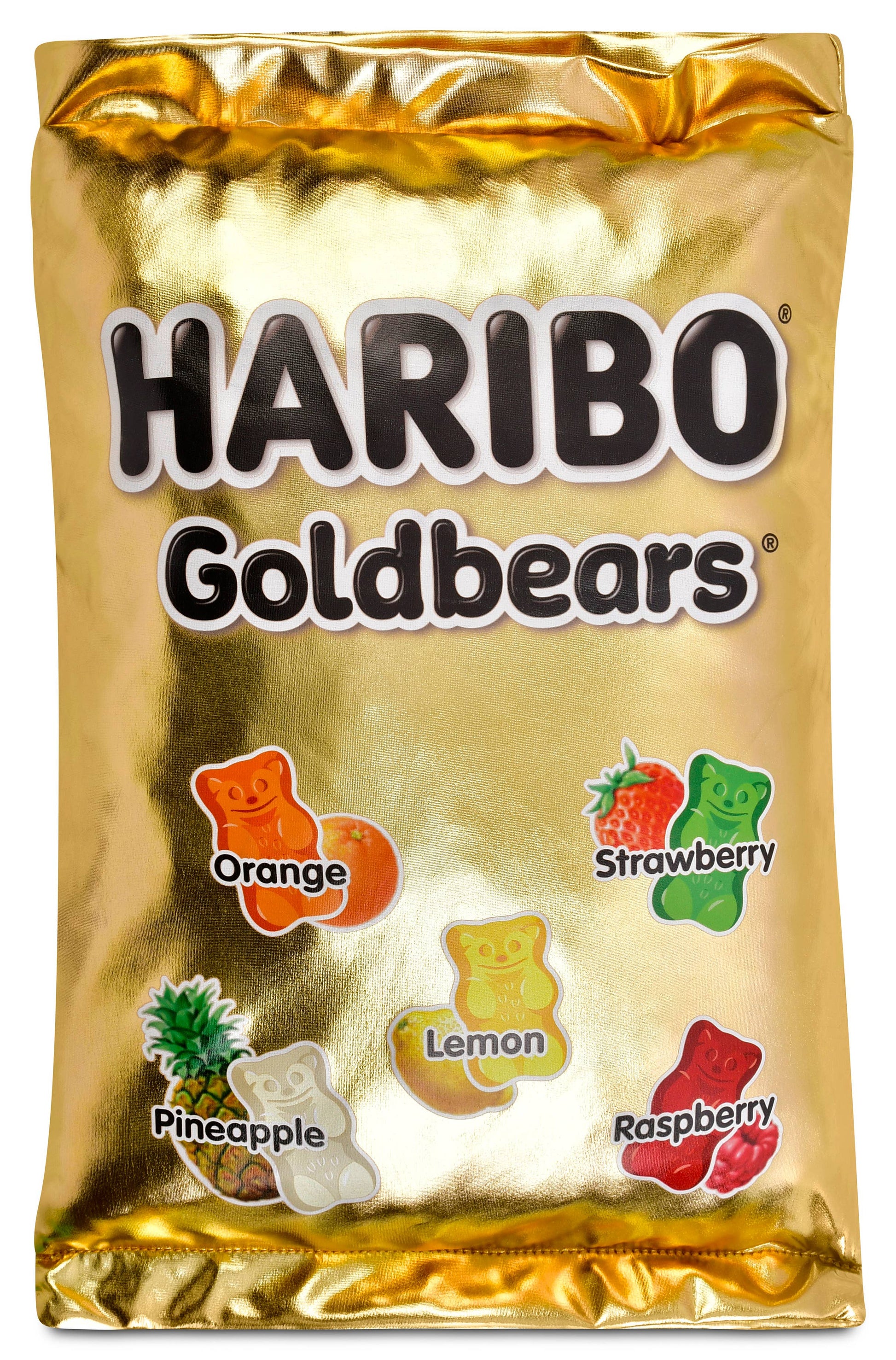Haribo Gummy Bears Packaging Plush by Iscream includes 5 removable mini Haribo characters. Made from Metallic and Fleece material with embroidered detail, 100% polyester, 100% polyfiber fill. 11 1/2" w x 17" h x 5" d