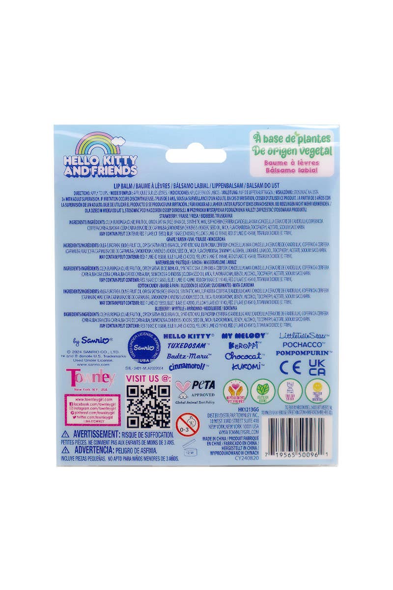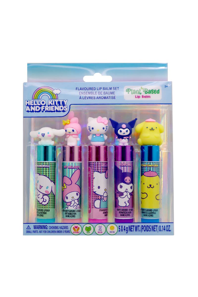 Hello Kitty & Friends Lip Balm Set. Features adorable lip balms with character figurines on the caps. Five fun, fruity flavors: Cinnamoroll (watermelon), My Melody (cotton candy), Hello Kitty (strawberry), Kuromi (grape), and Pompompurin (blueberry). These moisturizing lip balms are cute and practical, perfect for fans of Sanrio characters who want soft, flavored lips with a touch of charm. Plant based lip balms, kid friendly, vegan formula, Non GMO. 5 lip balms per set.