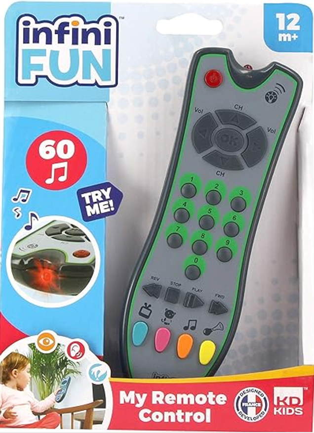 A funny remote control to play with and imitate grown-ups! The remote control features 4 game modes and triggers silly sounds and lights. There are 24 rubber keys of different shapes to change channels, volume and make use of the DVD function, each with their own sound effect to encourage little ones to discover the sounds of everyday life and learn through role play!
