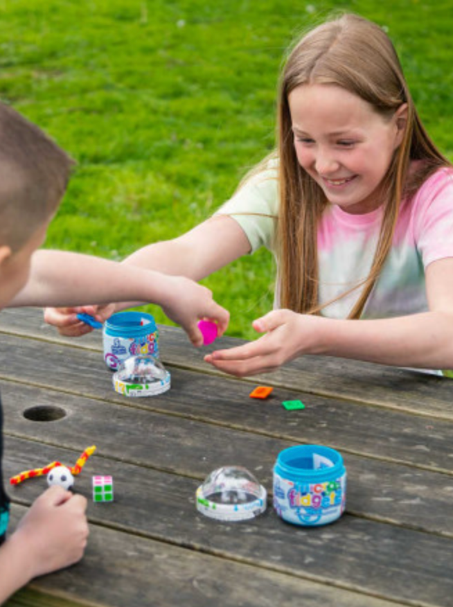 An assortment of 5 collectable micro fidget toys packaged inside a surprise container pod.