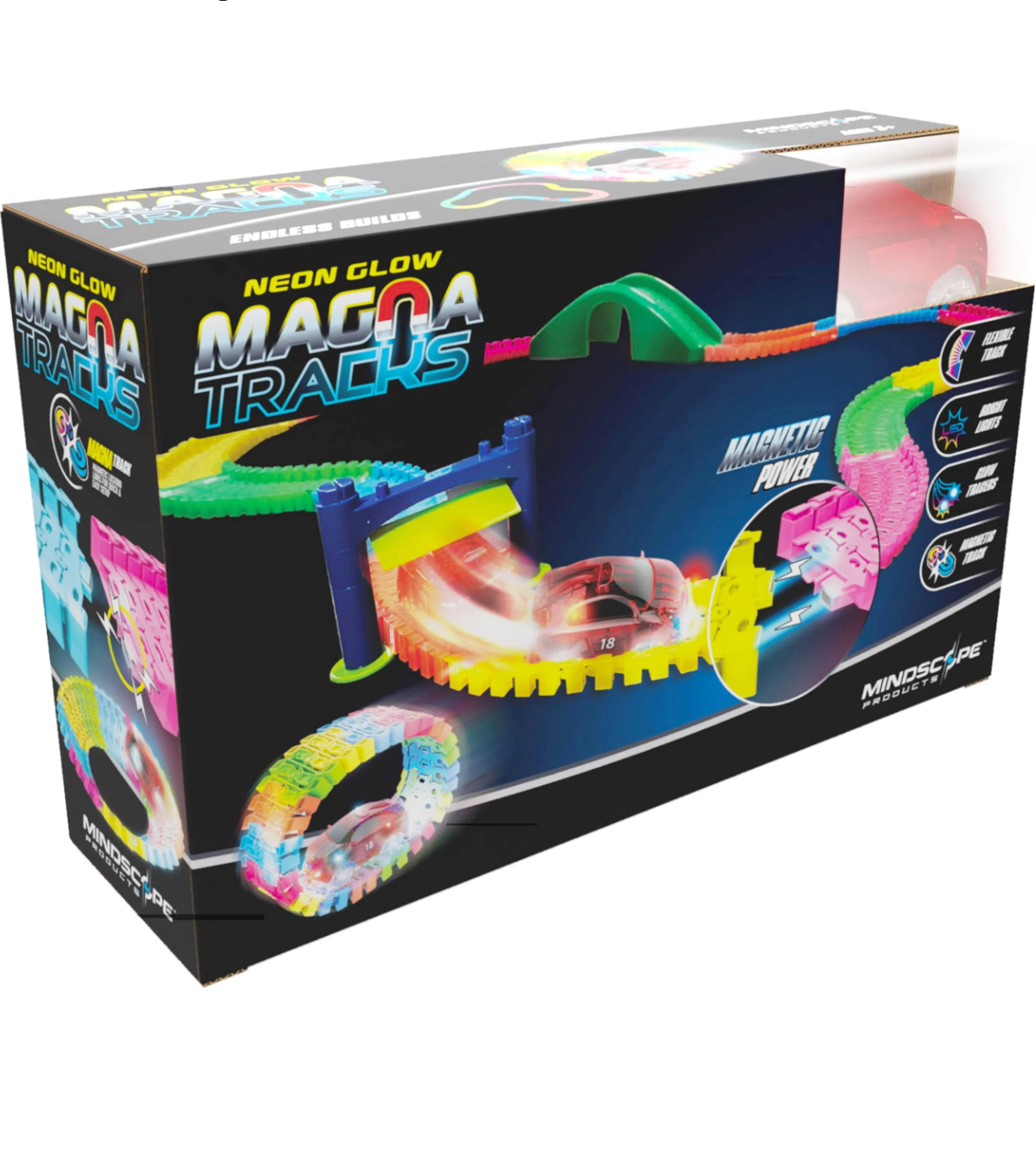 11 feet of Neon Glow In The Dark Magna Tracks. SAFE Magnetic Power, Magnets Hidden For Safety. Compatible with Twister Tracks. Comes with 1x Light up Race Car, 1x Crash Gate, and 1x Overpass Tunnel Race Car Contains Black Lights that Leave GLOW TRACERS on the Track!
