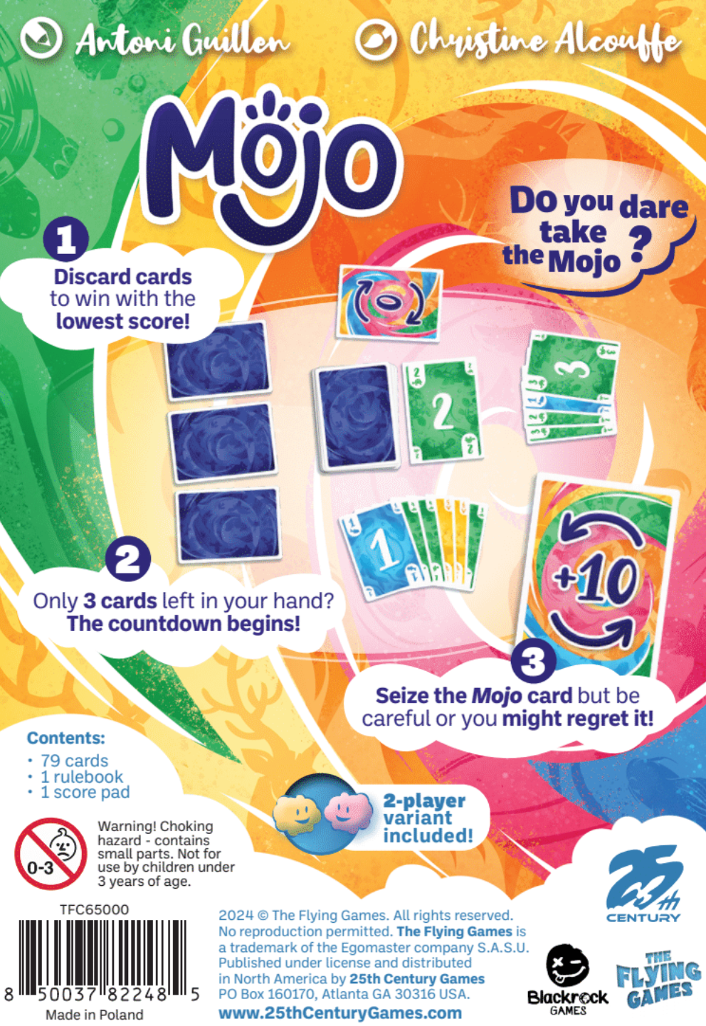 To win, you will need to have as few points as possible at the end of the game. To do this, discard your big cards OR prefer to play the small ones. Part with your cards OR keep those of the same suit. Do you have the Mojo card? Be good or you may regret it! Mojo is a real party game. The more people there are, the stronger the interaction. It is also fun to try different strategies over the games. Depending on our opponents and our cards, the options are numerous, which makes the game dynamic and different in each game. Mojo means extreme luck in everything you do. Nature is the source of its energy, and animals are its vectors May the Mojo be with you! 3-8 Players, Ages 8+, 30 minutes