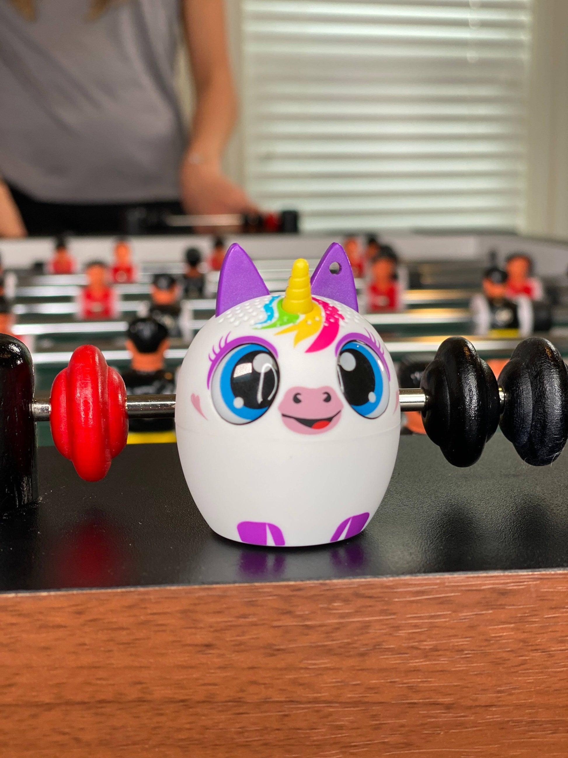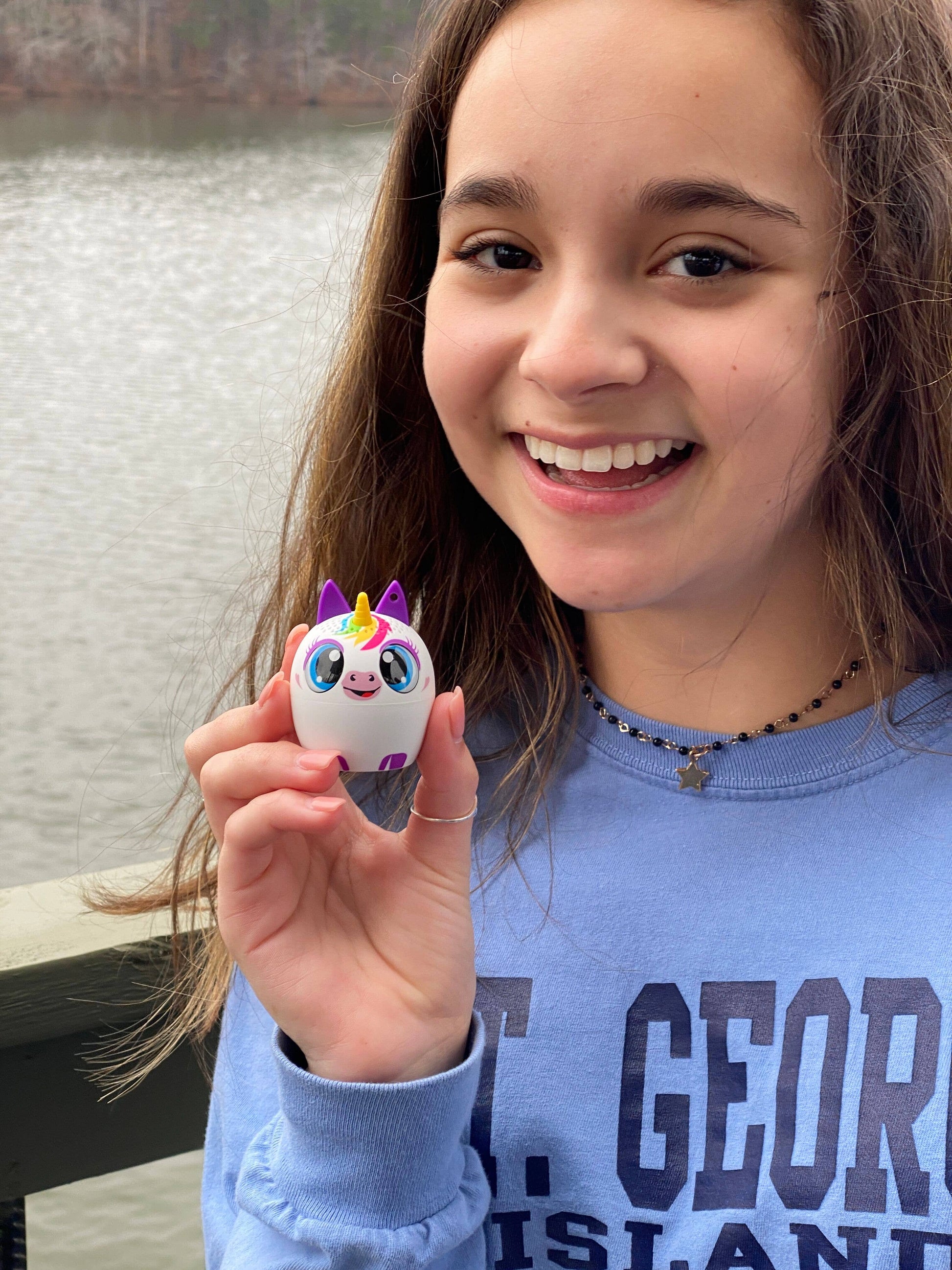 Unicorn (UniCHORD) - Mini Bluetooth Speaker. You'll be surprised by the mind-blowing sound and rich, clear quality. Bluetooth 5.0 provides clear and crisp sound. Easy connection to phone, tablets, laptops and computers. You can pair two and have True Wireless left/right channel stereo. The rechargeable battery will provide over 4 hours of playback. Talk hands-free - yep, it has a microphone. Woah... right?! Also includes a selfie remote. Take pics with one click so you don’t have to ask strangers. Use the speakers to play the free Hide & Speak app with your My Audio Pet . Download from Apple or Google and have some ridiculous fun when not listening to music.