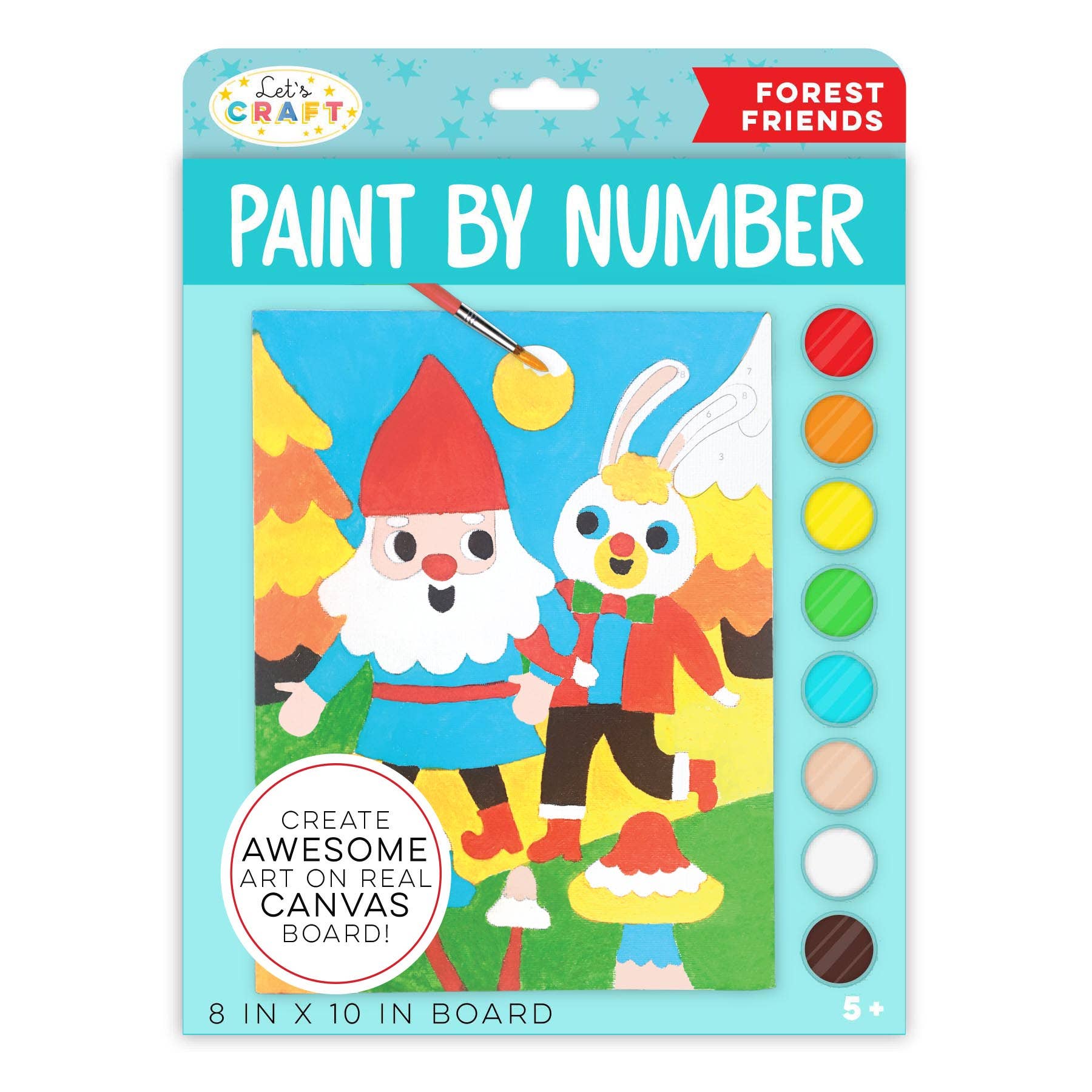 • Comes with 8 numbered paint pots with bright acrylic paint, paintbrush, 7" x 9" printed canvas board and instructions.