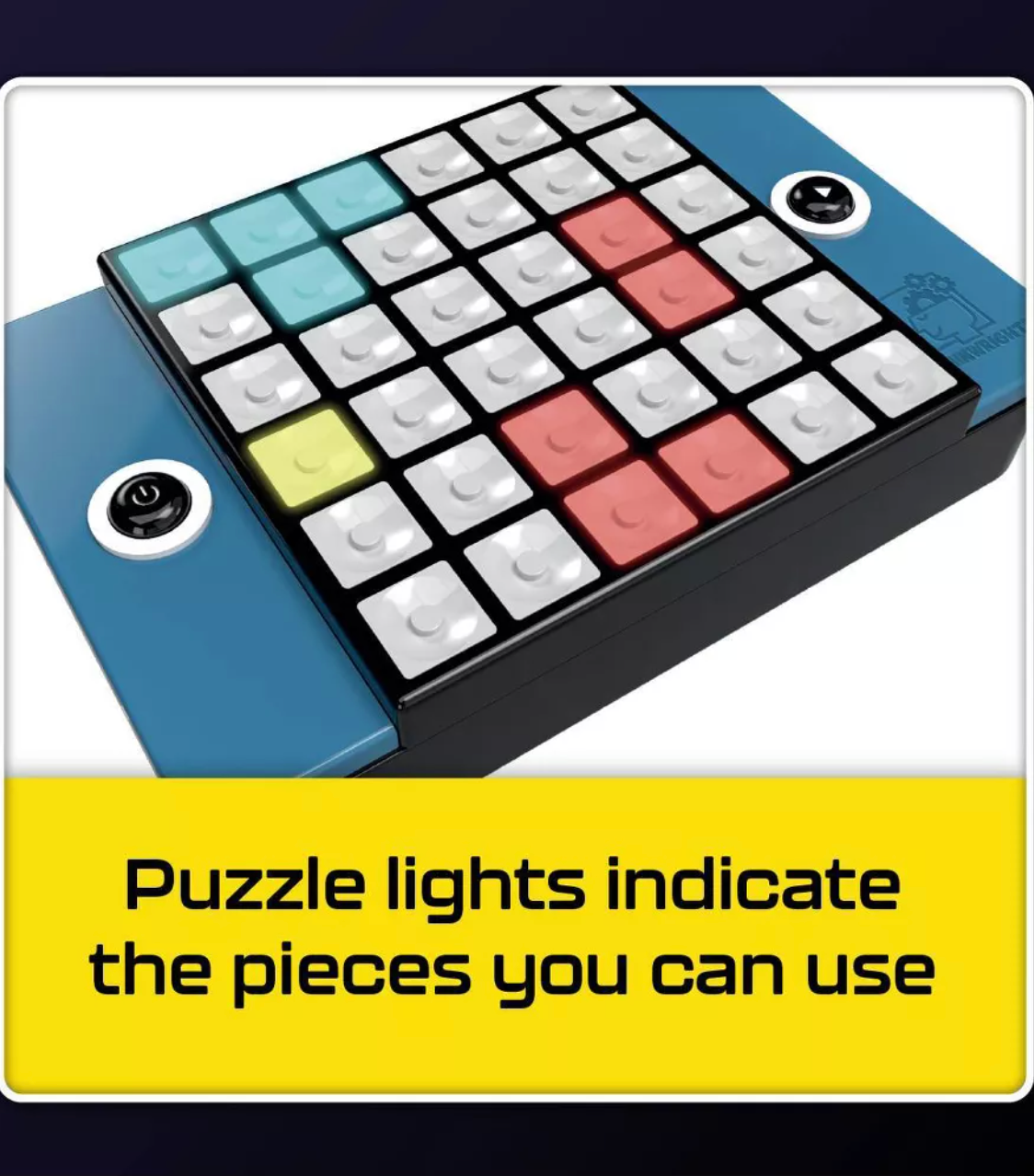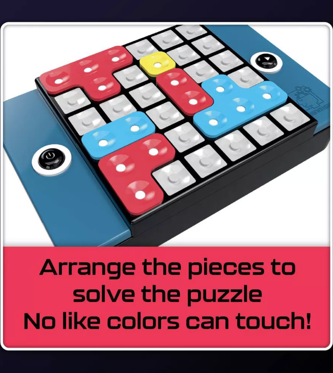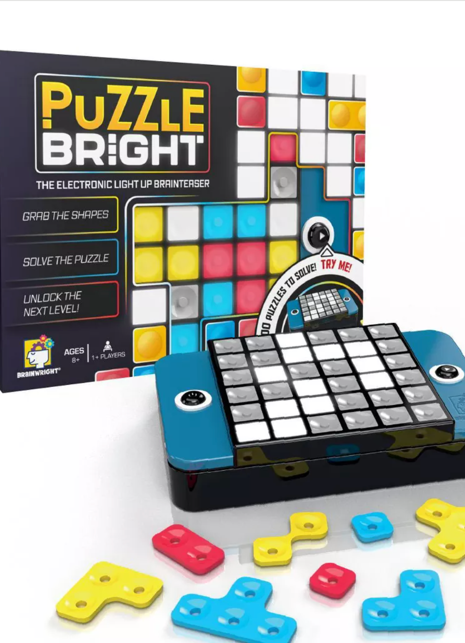 Puzzle Bright is an electronic light up brainteaser with over 300 puzzles to solve. The colored LED lights indicate which colored pieces you’ll need to solve the puzzle. Then, a unique shape is displayed on the screen. Use the pieces and cover the lights! Make sure no like colors are touching - there is only 1 correct solution for each puzzle. Challenge your mind with 300 puzzles in varying difficulty levels!