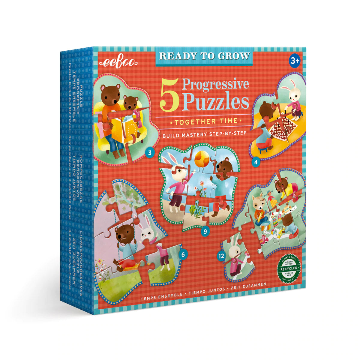Together Time Ready to Grow Progressive Puzzle set includes 5 different puzzles of varying complexity. Charming illustrations of a pair’s friendship and their daily activities are featured on each puzzle. Each puzzle has a uniquely colored background and border to aid in sorting the pieces, a first step in completion. The step by step mastery of the simpler puzzles lead children to take on the challenges of increasingly difficult puzzles, building confidence and creating a sense of accomplishment. This set contains a 3, 4, 6, 9 and 12-piece puzzles. Completed puzzles are approximately 8” in size.