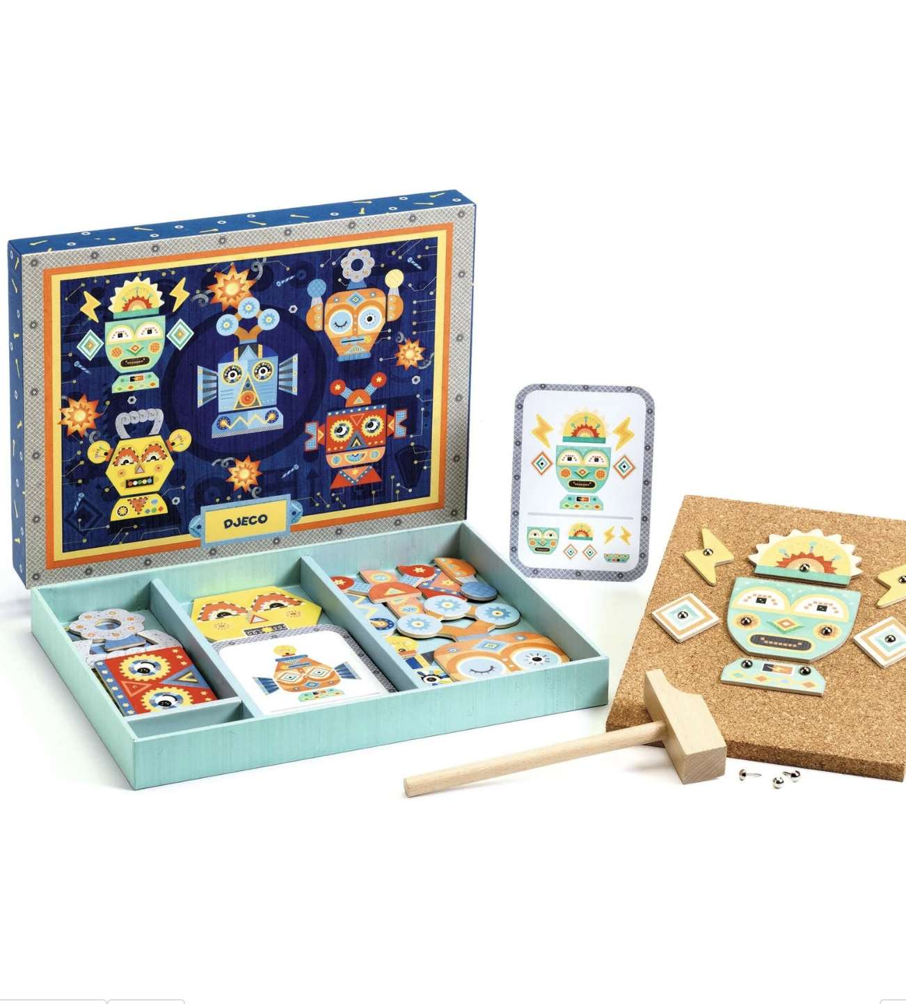 Tap Tap Robot is a classic nursery activity updated by Djeco to develop little ones’ dexterity. Children can build their own robots by attaching pieces to the cork board with a little hammer and nails. They can either follow the instructions or use their imagination to create their own limitless range of robots! Everything comes in a lovely wooden box!• A cleverly designed wooden box with compartments for storing everything at the end of a play session.