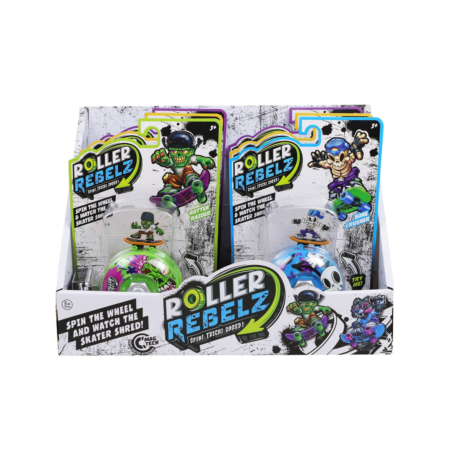 Introducing the latest action-packed craze - roller Rebelz! With 4 exclusively designed wheels and characters to collect - you'll want to skate them all. Connect your sk8ter to the wheel and watch them shred! Spin, roll, race, and battle but whatever you do don't fall off. Will you become the ultimate roller?