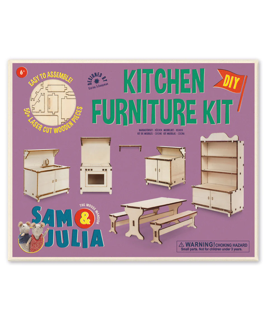 Create a mini kitchen with this furniture kit! The pre-cut wooden pieces can be easily assembled with simple instructions and are 1:12 scale. Based on the Mouse Mansion book series by Karina Schaapman, the kit lets you bring the charming world of Sam and Julia to life. This furniture kit includes a miniature stove, a sink, a dining table, a kitchen cupboard, and two dining benches. Paint, glue, and accessories are sold separately.