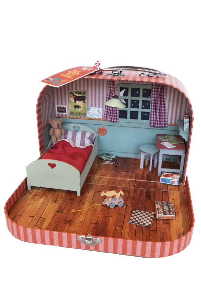 Take Sam and Julia everywhere you go in this fun little suitcase. Of course, you assemble this bedroom 'to go' yourself. This suitcase was designed by Karina Schaapman, the creator of the original Mouse Mansion.