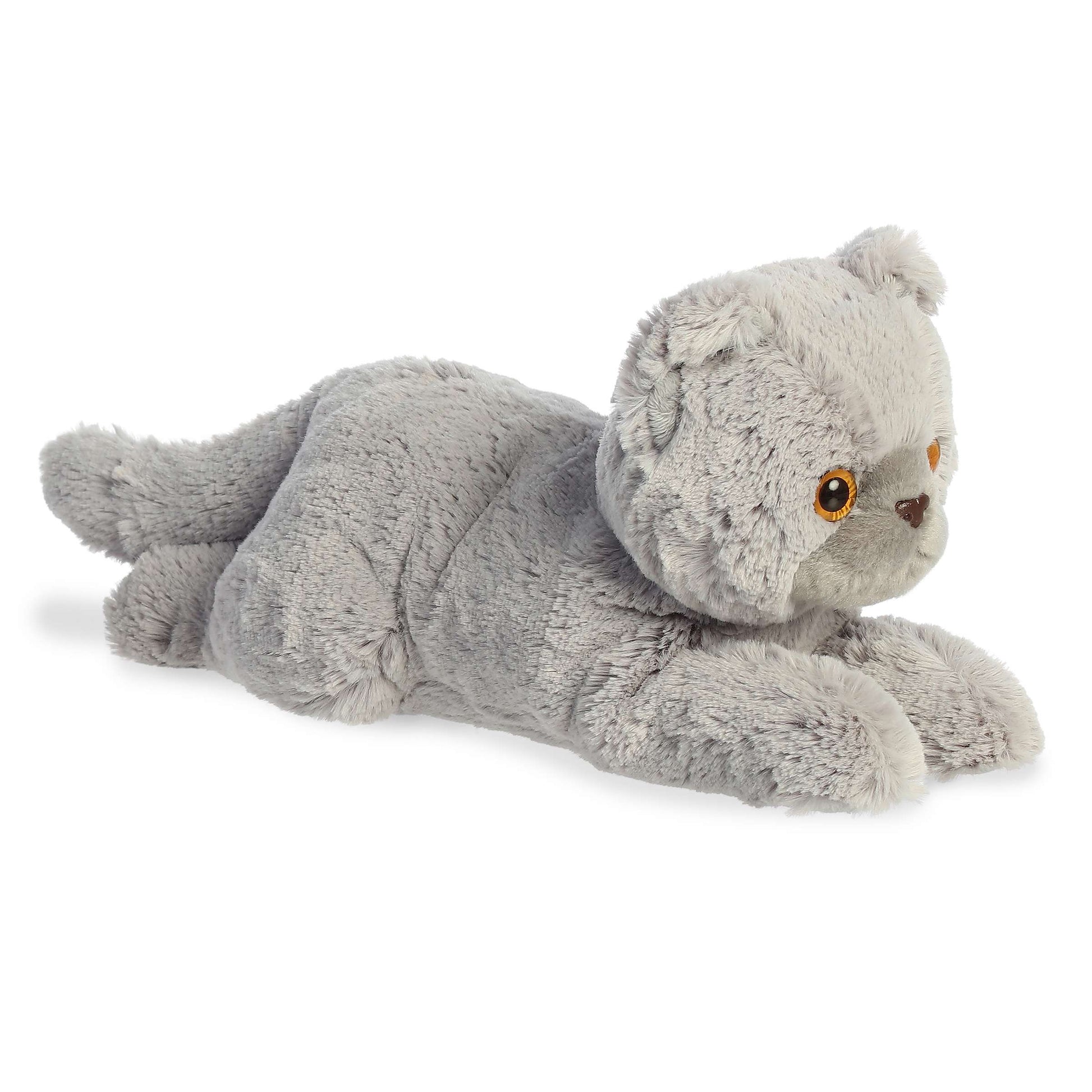 Scotty Cat Flopsie is an adorable take on the Scottish fold feline breed This plush features a blue-grey tone kitty with precious folded ears making for a round, lovable face