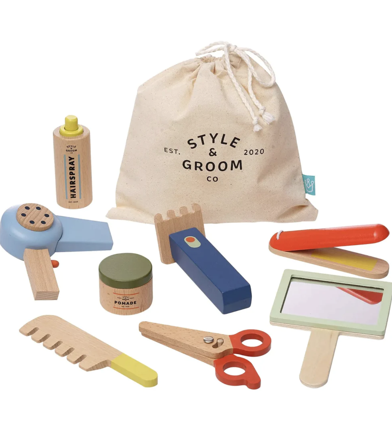 A fresh look awaits with the help of the imaginative Style & Groom wood hair styling set. A real bargain, this nine-piece grooming playset for kids includes one hair dryer, one straightener, one comb, one hair clipper, one baby-safe mirror, one pair of scissors - that actually open and close, one pomade jar with removable lid, one hairspray bottle with press-down nozzle and rattle sound, plus a fabric drawstring bag for storage. Toddlers and up can imagine lots of hair salon and barbershop playtime fun. Encourages imaginative role-play, cause and effect learning and motor skill development. Style & Groom comes in giftable package measuring 2.75"D x 8"W x 7"H.