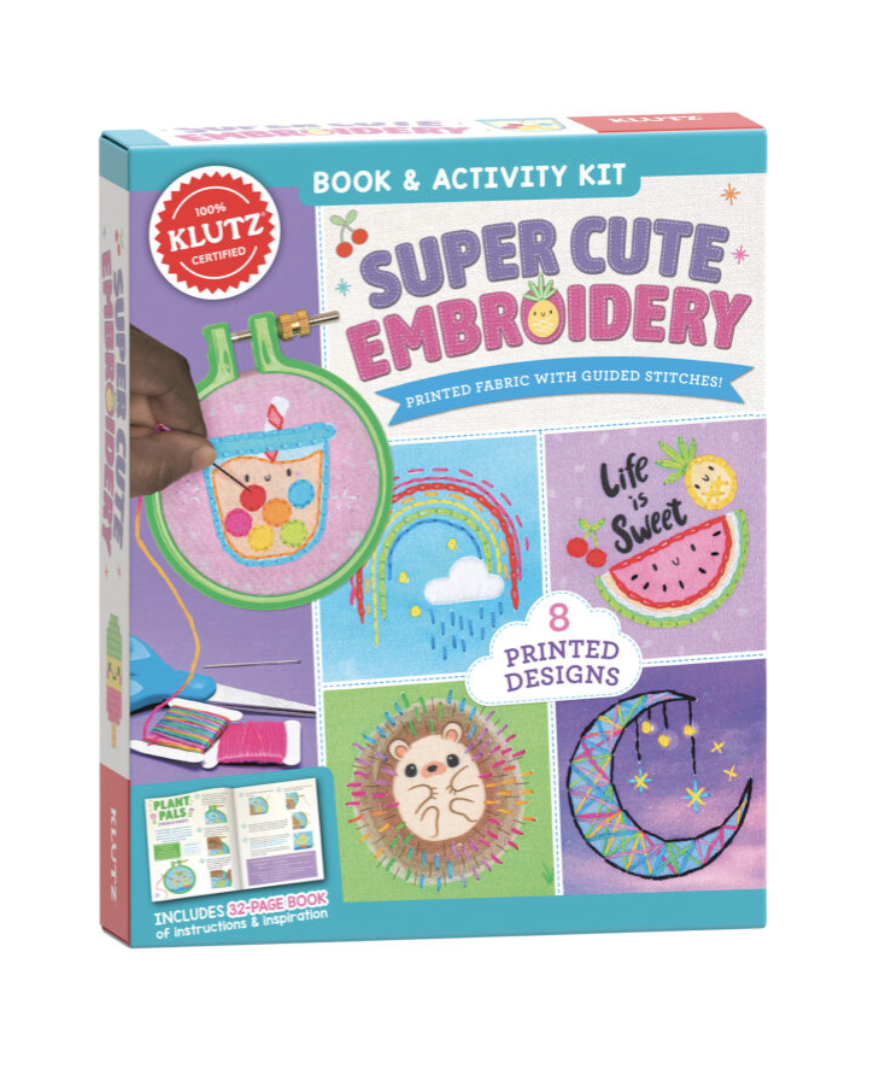 Learn the classic art of embroidery with a cute twist. Select your favorite design, fix it in your hoop and start stitching! The 32-page book teaches you all the stitches you'll need to sew 8 colorful canvases. Using colorful, pre-printed designs as a guide, you can stitch as much or as little as you want to achieve cuteness. When you are done, keep reading for tips on how to display your adorable art.