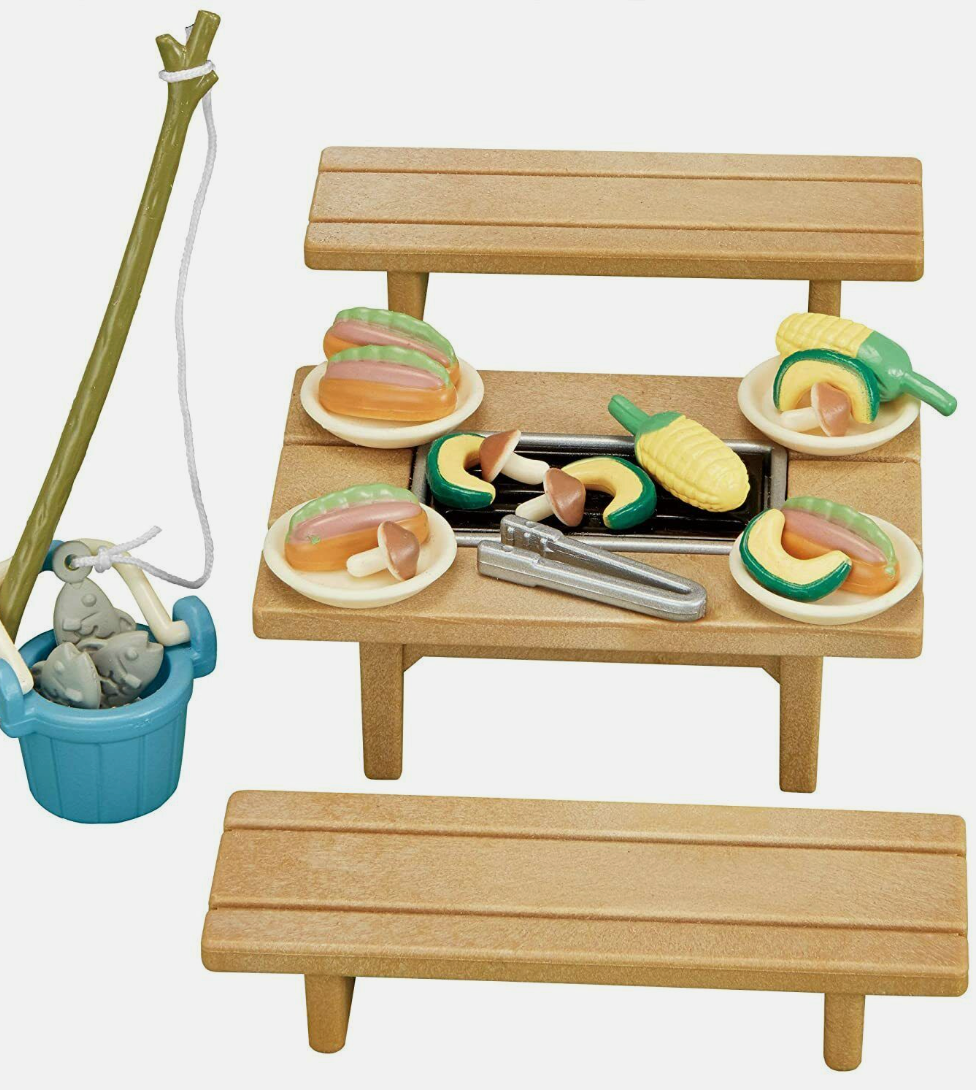 Cute little accessory set for Sylvanian Families (Calico Critters)! It includes one picnic table with grill center, 2 benches, one fishing pole and 3 fish, one bucket, 4 plates, a pair of tongs, 2 corn cobs, 4 hot dogs, 4 mushrooms, and 4 melon slices.