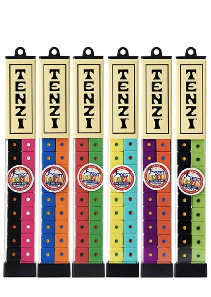 The world’s fastest game! Everyone gets ten dice. Someone says, “Go.” Then everyone rolls and rolls as fast as they can until someone gets all their dice on the same number and shouts “TENZI.” Lots of different ways to play. A fun fast frenzy for the whole family!
