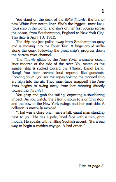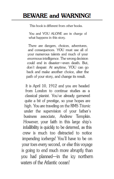 It is April 10, 1912 and you are a passenger aboard the RMS Titanic. A dangerous iceberg looms in the ship's path. Will you make it to your destination? Depending on the choices you make, the crisis we know from history might be averted forever!