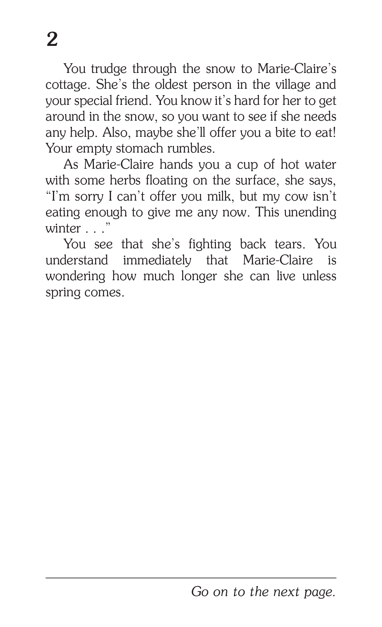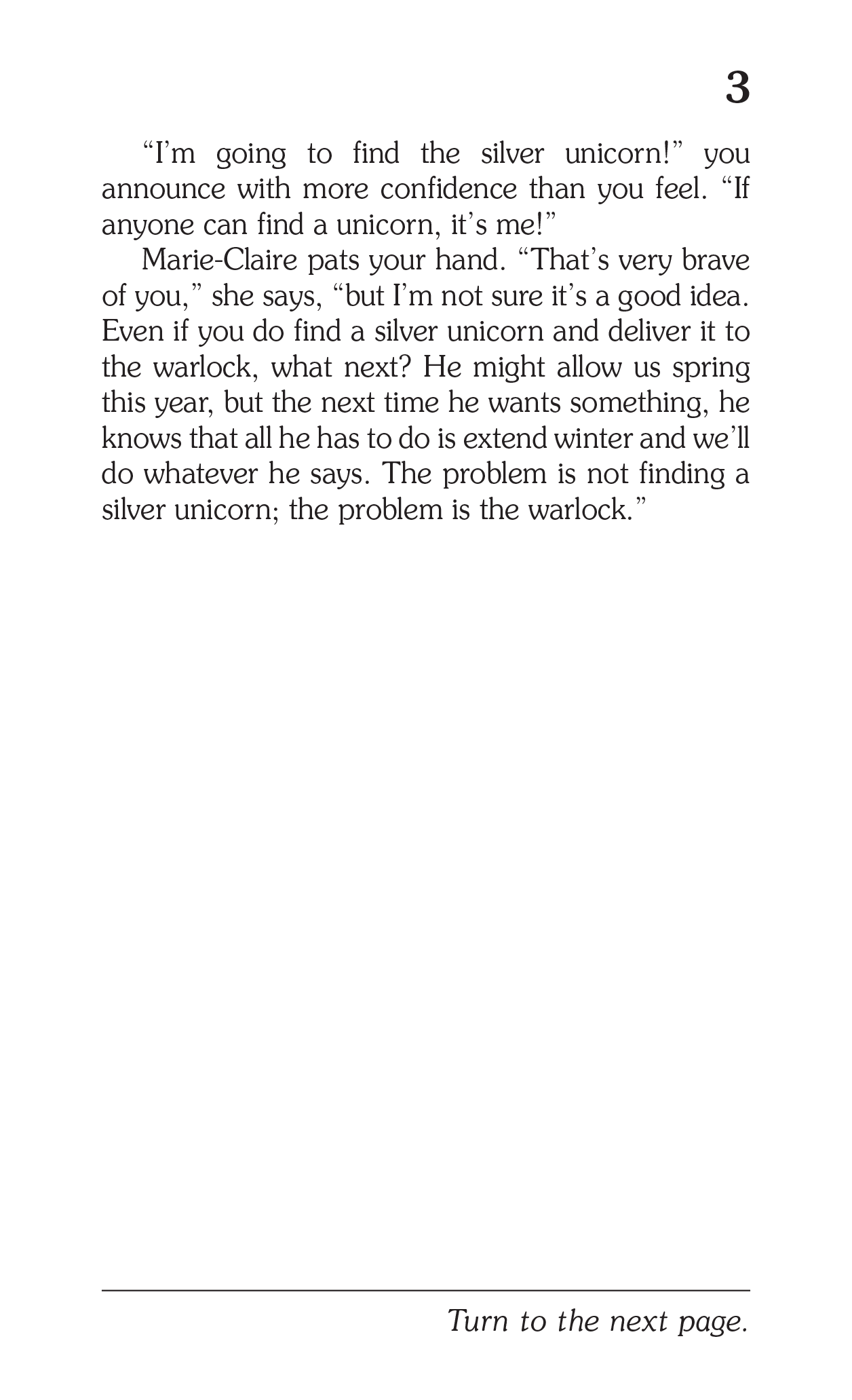 In The Warlock and the Unicorn (the sequel to The Magic of the Unicorn) an angry warlock has doomed the people of Flanders to an eternal winter. The only way he will reverse the unending snow and cold is via the gift of a silver unicorn. The problem? No one has ever seen one. Do they even exist? You must decide: do you leave your village to battle the warlock on your own or do you go in search of a silver unicorn?