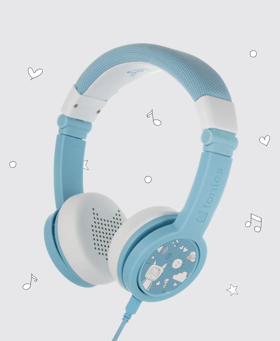 Meet the tonies® Headphones! These foldable, durable, kid-safe, volume-limiting headphones come in six colors to match your Toniebox. Each headphone set includes a matching sticker set and a detachable audio cable with a BuddyJack splitter for sharing storytime with up to four sets of headphones from a single Toniebox.