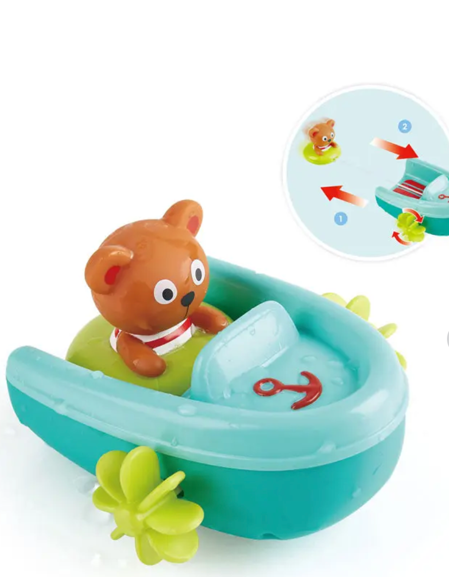 - Pull back the teddy bear and the boat will actually paddle along until the bear reaches the boat again