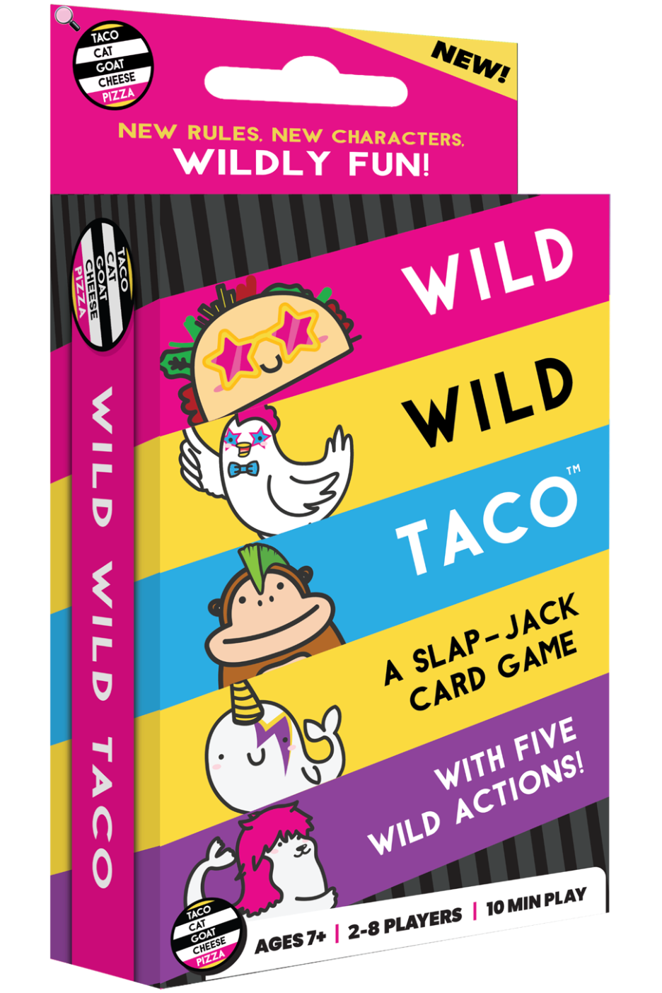 This game has more of all the specials you love from Taco Cat Goat Cheese Pizza! Special action cards from the original game plus NEW characters are included in this game. But in this game, the Taco is wild while the specials are not…unless two are played in a row!