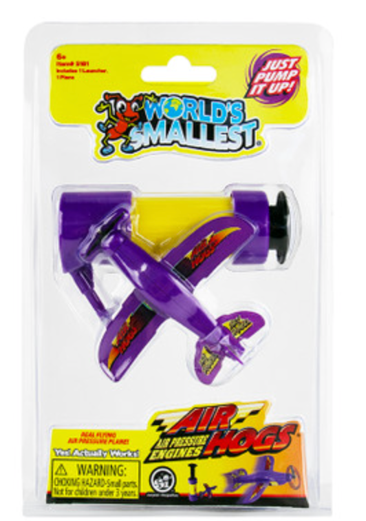 Tiny takes flight with the World’s Smallest Air Hogs SKY SHARK! Just pump it up and fly! Introducing World's Smallests real flying air pressure plane - Air Hogs! Actually works - includes 1 launcher and 1 plane.